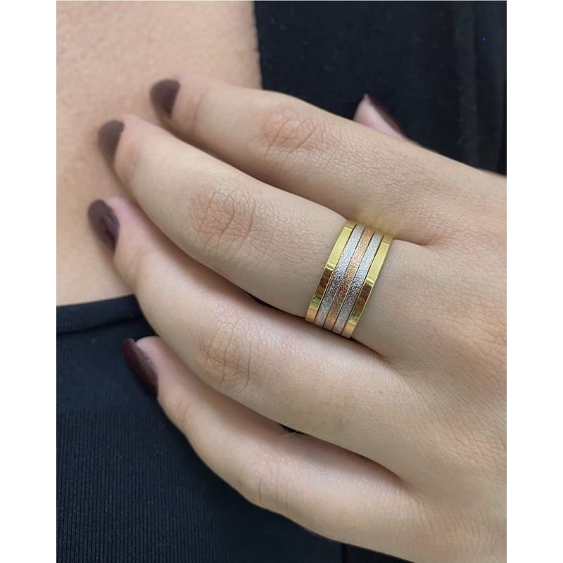 Elegância em cada detalhe! Este anel 5 elos folheado a ouro 18k, combina o brilho do dourado com a sofisticação do acabamento fosco em três tons: dourado, branco e rosé. Seu design amplo e moderno traz presença e estilo, ideal para mulheres que gostam de joias marcantes e refinadas.