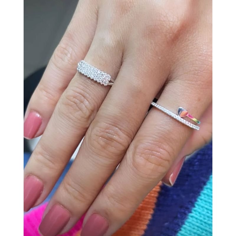Romântico e delicado, este anel é confeccionado em Prata 925 e apresenta um design moderno com duas hastes: uma com acabamento liso que sustenta um charmoso coração e outra cravejada com micro zircônias brancas, que proporcionam um brilho sutil e elegante.