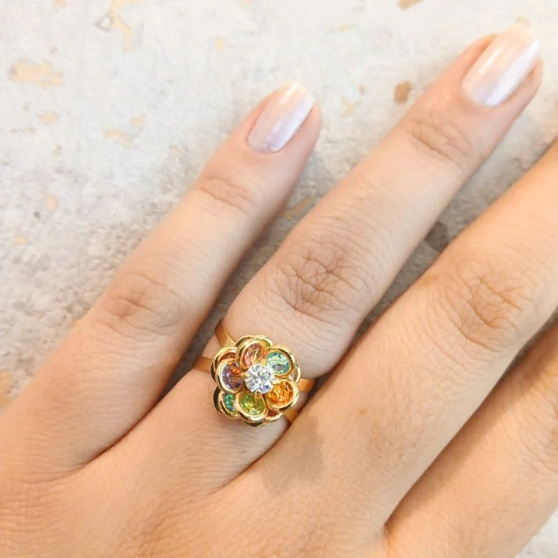Encantador e cheio de personalidade, o anel flor colorida folheado a ouro é a escolha perfeita para quem ama peças delicadas com um toque de cor.