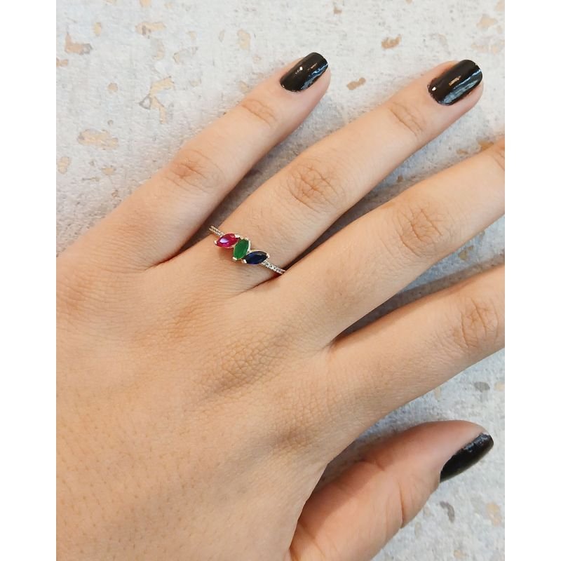 Um anel delicado e cheio de estilo, feito em Prata 925, com três pedras coloridas lapidadas em formato navete. As cores vibrantes trazem um toque moderno e elegante, perfeito para quem gosta de acessórios que combinam brilho e personalidade. Ideal para usar sozinho ou em mix com outros anéis de prata.