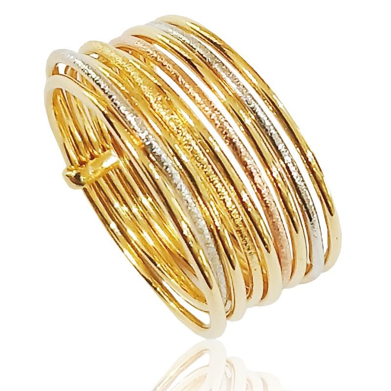 Com um design moderno e ousado, o anel 9 elos folheado a ouro 18K é a escolha perfeita para quem ama estilo com personalidade! A peça traz nove aros entrelaçados, com acabamento polido e detalhes em ouro, ouro branco e rosé, criando um visual sofisticado e contemporâneo.