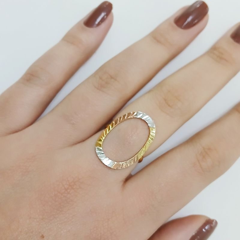 Destaque seu estilo com este anel folheado a ouro, antialérgico, que une design moderno e acabamento sofisticado. Com formato oval vazado, a peça exibe textura frisada em toda a borda, criando um efeito luminoso e cheio de personalidade. Ideal para quem busca um acessório ousado e elegante, perfeito para compor looks autênticos e atuais.