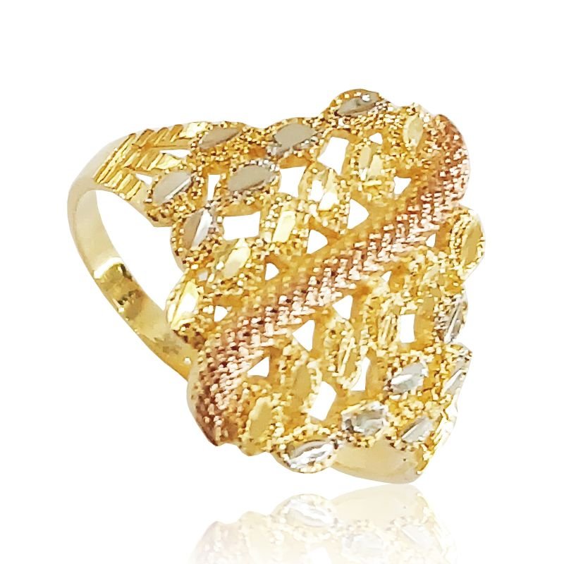 Imponente e delicado ao mesmo tempo, este anel trabalhado, folheado a ouro 18k é pura sofisticação! Com um design vazado, detalhes em relevo e acabamento em três tons — dourado, rosé e branco —, ele se destaca como uma verdadeira obra de arte em forma de joia.