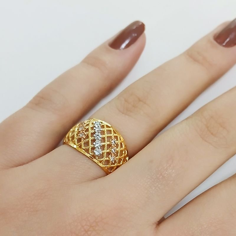 Delicado e cheio de charme, este anel trançado folheado a ouro 18K é a combinação perfeita entre sofisticação e leveza. Seu design vazado em trama delicada valoriza o brilho das zircônias cravadas em linha, com detalhes nos tons rosé e branco, que formam um efeito tricolor encantador.