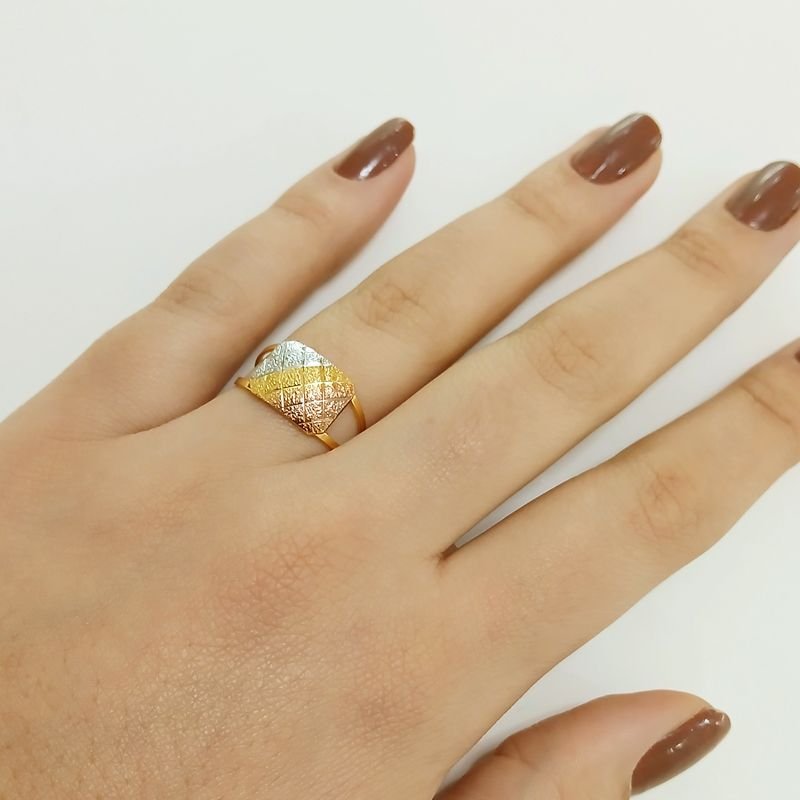 Beleza que impressiona! Este anel tricolor folheado a ouro 18K traz um design geométrico moderno com textura diamantada em três tons — dourado, rosé e branco — criando um efeito sofisticado e atemporal. Sua base delicada com aros duplos valoriza o dedo com leveza e elegância.