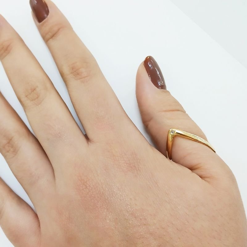 Anel moderno folheado a ouro 18k, com design geométrico vazado que transmite sofisticação e originalidade.