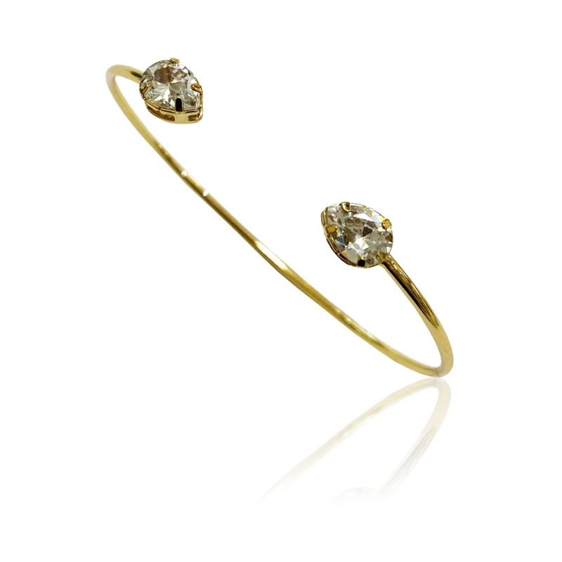 Delicado e sofisticado, este bracelete apresenta design aberto, finalizado com duas zircônias lapidadas em formato de gota, que garantem brilho e elegância na medida certa. Folheado a ouro 18k, é uma joia versátil e atemporal, perfeita para usar sozinha ou em combinações modernas.