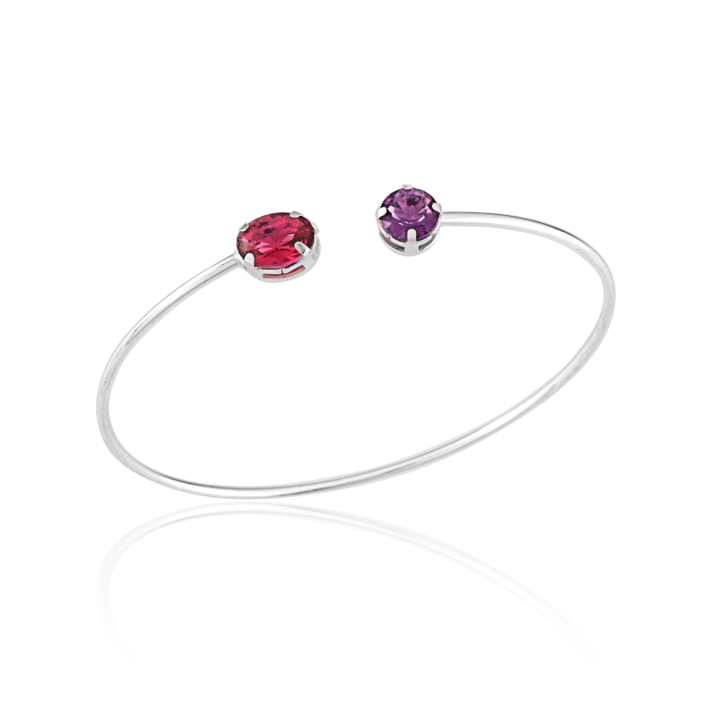 Moderna e delicada, este bracelete em Prata 925 traz duas zircônias em destaque – uma turmalina rosa e a outra ametista – que conferem um toque vibrante e elegante à peça. Seu design minimalista combina com diversos estilos, sendo perfeita para composições delicadas ou para usar sozinho como protagonista do look. Produzida com material antialérgico, garante conforto e segurança durante o uso. Uma joia versátil que une cor, leveza e sofisticação.