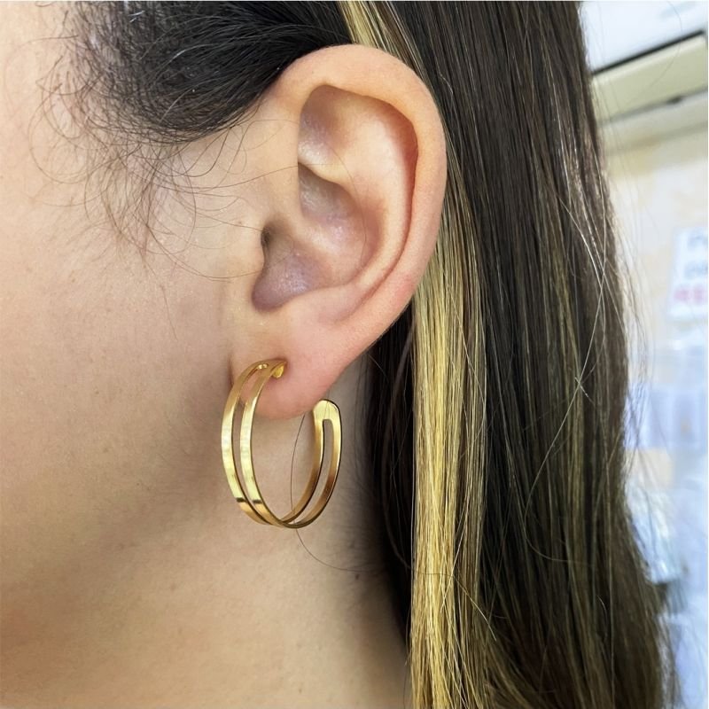 O brinco argola dupla folheado a ouro 18k é a escolha perfeita para quem busca sofisticação com um toque moderno. Seu design diferenciado traz duas hastes paralelas, com acabamento polido e brilho intenso, que refletem elegância em cada detalhe.