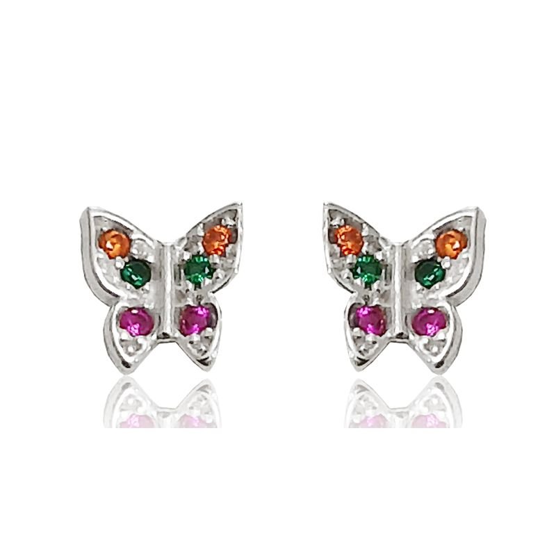 Brinco em prata 925, em formato de borboleta, cravejado com pedrinhas coloridas em laranja, verde e rosa. Leve, delicado e antialérgico, é perfeito para trazer alegria e encanto ao visual infantil.