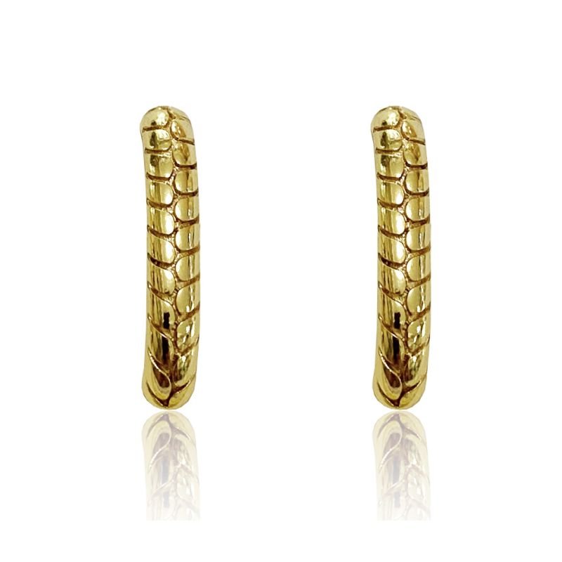 Brinco estilo ear hook folheado a ouro 18K, antialérgico, com acabamento texturizado que lembra escamas. Uma peça moderna e ousada que adiciona um toque de personalidade ao look, ideal para quem busca acessórios diferenciados e cheios de estilo.