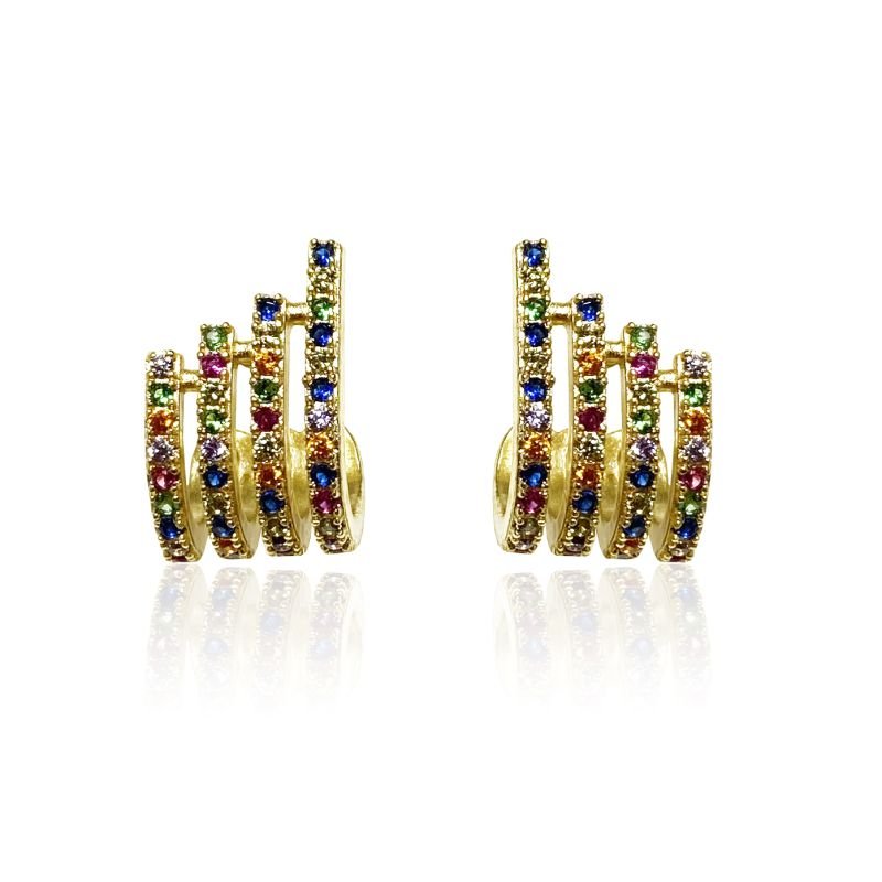 Brinco moderno e ousado, modelo ear jacket, folheado a ouro 18k e ricamente cravejado com zircônias coloridas. Seu design escalonado e multifaixas cria um efeito visual impactante, ideal para quem deseja um acessório vibrante e cheio de personalidade. Antialérgico, proporciona conforto e segurança durante o uso. Uma peça que transforma qualquer look com estilo e brilho único.
