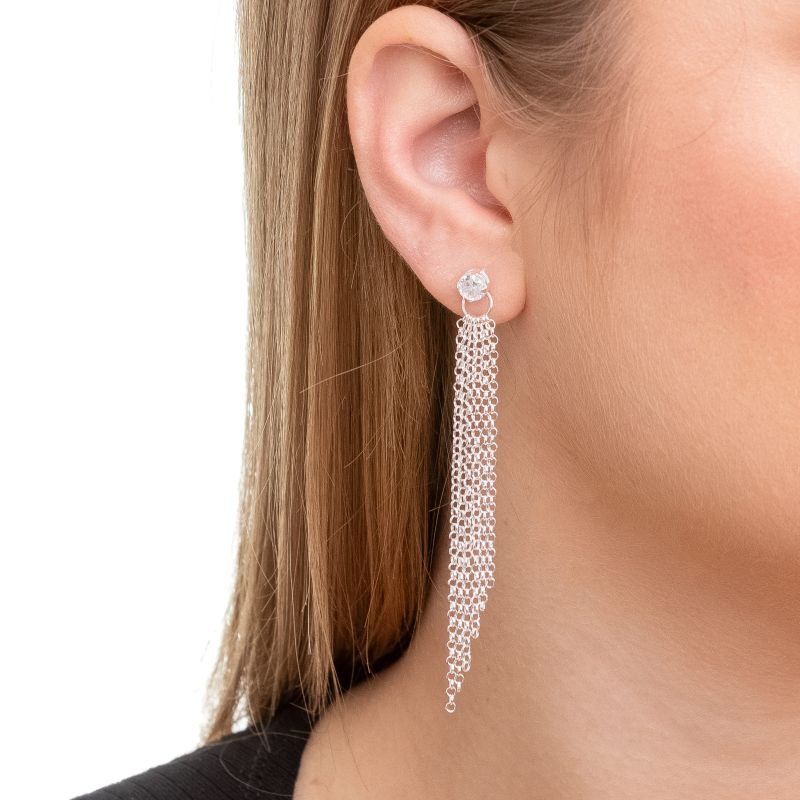Com design sofisticado e marcante, este brinco franja é confeccionado em prata 925 e possui uma zircônia central que adiciona brilho ao look. As delicadas correntes formam franjas elegantes que acompanham o movimento com leveza e estilo. Ideal para eventos especiais ou para elevar produções noturnas com um toque de glamour.