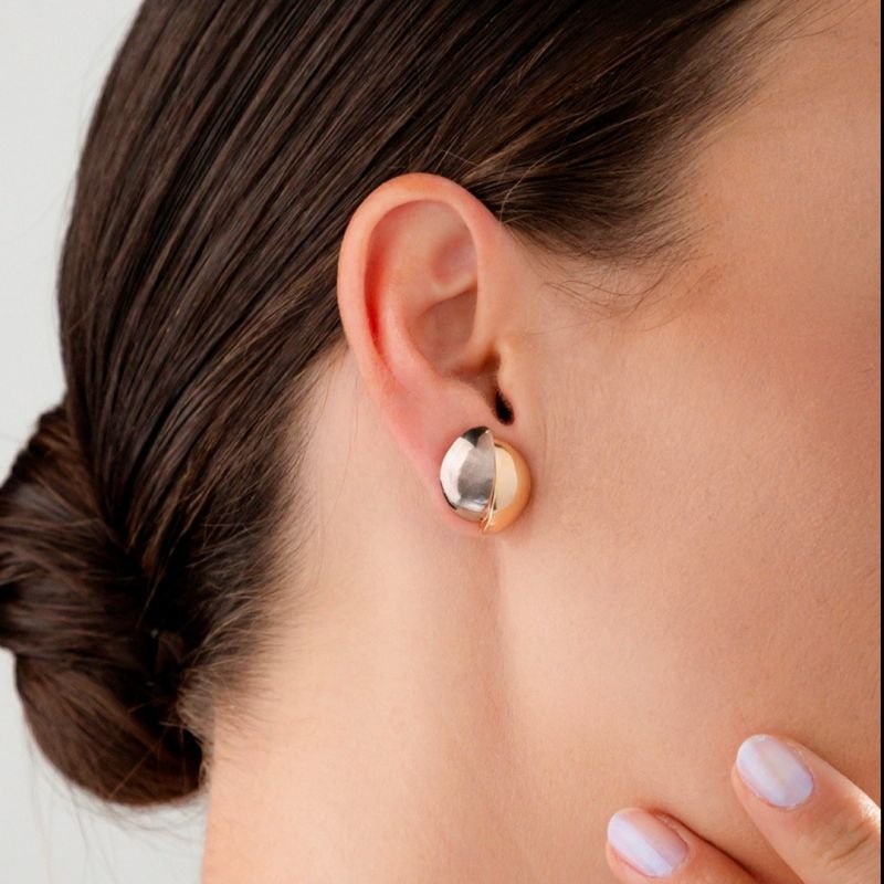 Brinco meia esfera bicolor, folheado a ouro 18k, com acabamento polido que reflete sofisticação e modernidade. Seu design é marcado pela fusão harmoniosa entre o dourado e o prateado, criando um contraste elegante e atemporal. Antialérgico e confortável, é perfeito para quem busca um acessório versátil e cheio de personalidade para o dia a dia ou eventos especiais.