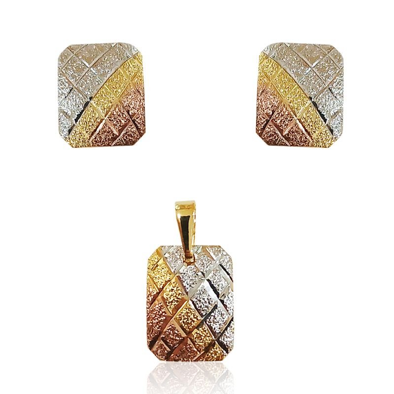 Elegância e brilho em cada detalhe! Este conjunto folheado a ouro, antialérgico, é composto por brincos e pingente com formato retangular e acabamento texturizado em três tons: dourado, prateado e rosé. O design geométrico com efeito diamantado confere um visual moderno e sofisticado, ideal para quem busca um acessório marcante e versátil para compor looks elegantes com muito charme.
