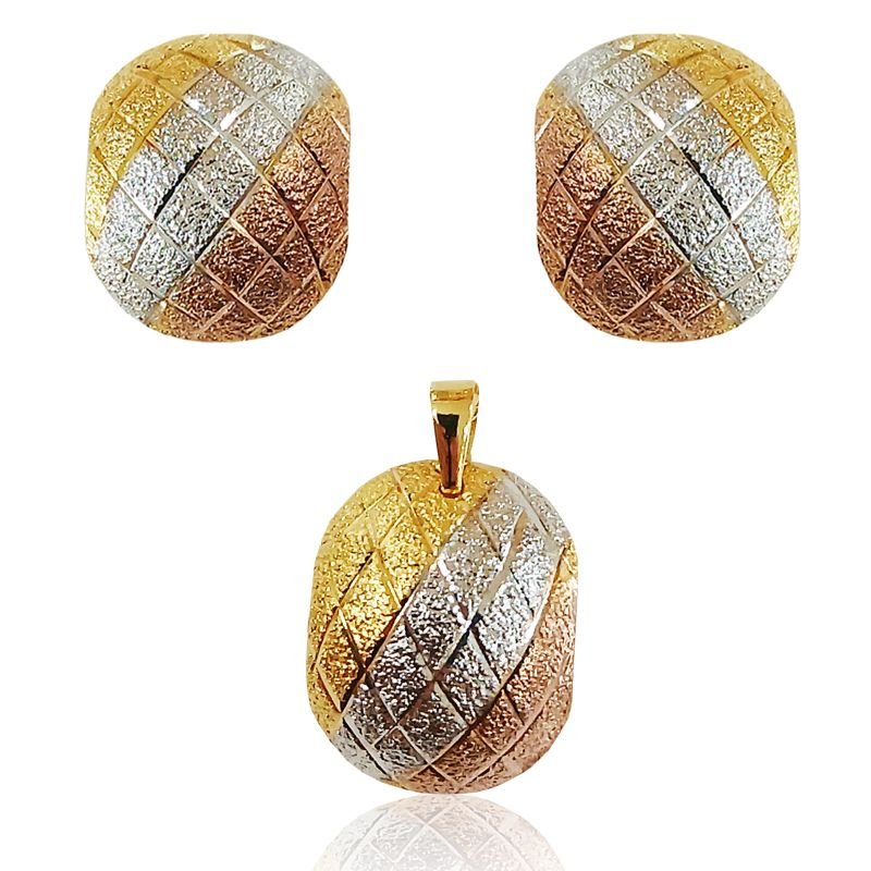 Realce sua beleza com este elegante conjunto folheado a ouro 18k, antialérgico e com acabamento sofisticado. Composto por pingente e brincos em formato oval, o design traz um trabalho texturizado em tons tricolores (dourado, prateado e rosé), formando um delicado padrão geométrico que transmite modernidade e requinte. Ideal para quem busca peças versáteis, confortáveis e cheias de estilo para o dia a dia ou ocasiões especiais.