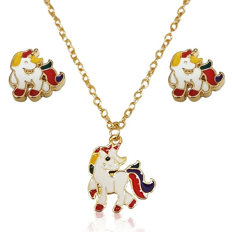 - Conjunto composto por corrente, brincos e pingente de unicórnio.
