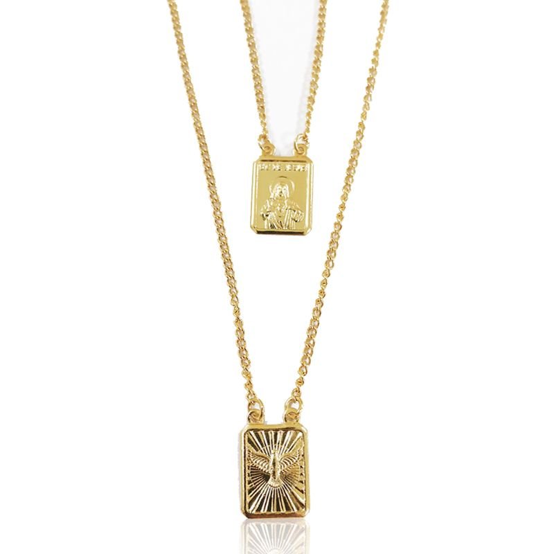 Este escapulário folheado a ouro é uma joia repleta de significado e devoção. Com duas medalhas retangulares finamente detalhadas — uma representando o Sagrado Coração de Jesus e a outra o Espírito Santo — ele é unido por uma elegante corrente estilo groumet. Antialérgico e confortável para o uso diário, é a escolha perfeita para quem deseja carregar proteção e fé com estilo e sofisticação.