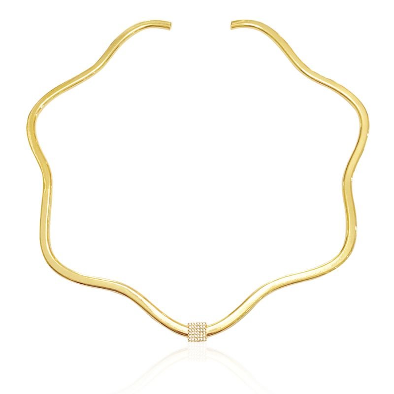 Gargantilha Aro folheada a ouro 18k com design ondulado e moderno. Seu formato orgânico confere um toque contemporâneo e sofisticado, enquanto o detalhe central com acabamento texturizado adiciona charme e delicadeza à peça. Um acessório marcante e elegante, perfeito para realçar o colo com estilo e autenticidade. Ideal para compor looks sofisticados ou dar um toque de ousadia ao visual casual.