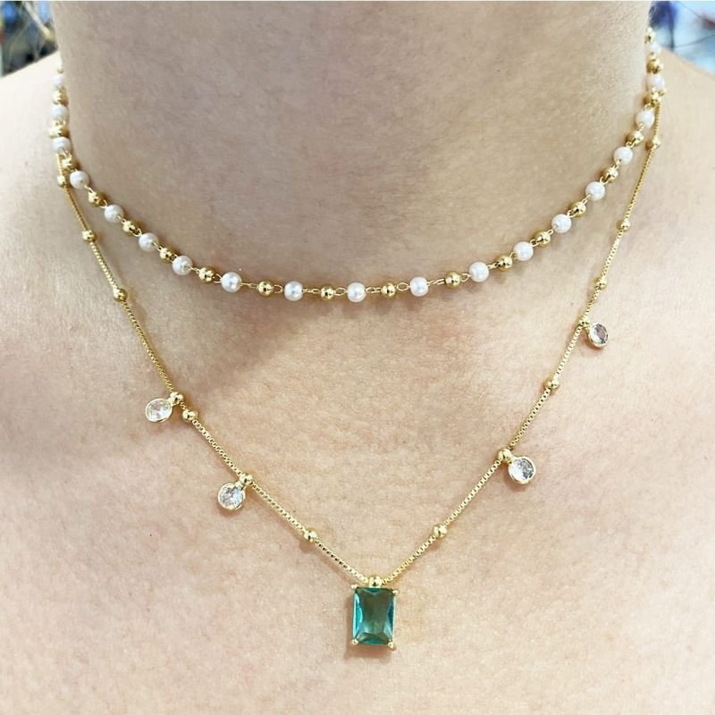 Gargantilha folheada a ouro 18k com design elegante e atemporal. O modelo apresenta corrente delicada com pequenas bolinhas intercaladas e pontos de luz em zircônia cristal, que trazem brilho sutil e sofisticado à peça. O destaque fica por conta do pingente central retangular com zircônia verde, que adiciona cor, charme e um toque de personalidade ao visual.