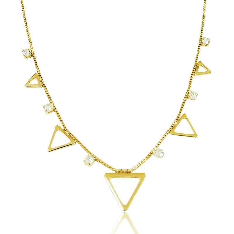 Moderna e sofisticada, esta gargantilha choker traz pingentes em formato de triângulos acompanhados de delicadas zircônias que proporcionam brilho sutil e elegante. Folheada a ouro 18k, é uma joia versátil, perfeita para compor looks casuais ou dar um toque especial em produções mais elaboradas.