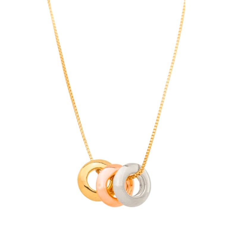 Gargantilha delicada e moderna com pingentes em formato de argolas lisas, formando um elegante mix de banhos: ouro amarelo, ouro rosé e ródio. A corrente fina realça ainda mais o contraste harmonioso entre os três tons, criando uma peça versátil que combina com diferentes estilos e ocasiões. Ideal para quem busca um toque de sofisticação e originalidade no dia a dia.
