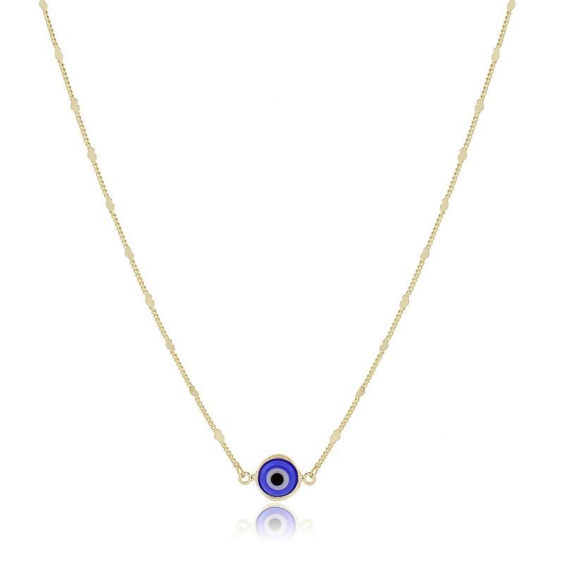 Esta delicada gargantilha com olho grego, folheada a ouro 18k, é perfeita para quem busca proteção com estilo. Com corrente de elos delicados e detalhes polidos ao longo do fio, o pingente central em azul intenso simboliza o olhar contra energias negativas. Moderna, leve e antialérgica, é ideal para compor looks minimalistas com um toque de espiritualidade e elegância. Uma joia versátil para usar todos os dias ou presentear com significado.