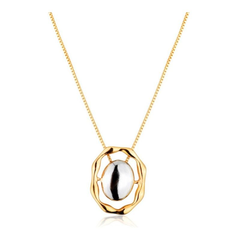 Gargantilha folheada a ouro 18k, antialérgica, com design moderno e elegante. O pingente possui uma estrutura orgânica vazada em dourado, que envolve um elemento central metálico prateado com acabamento polido, criando um contraste sofisticado. Ideal para compor looks contemporâneos com um toque de estilo e personalidade, essa peça é perfeita para quem busca delicadeza e originalidade em uma joia versátil.