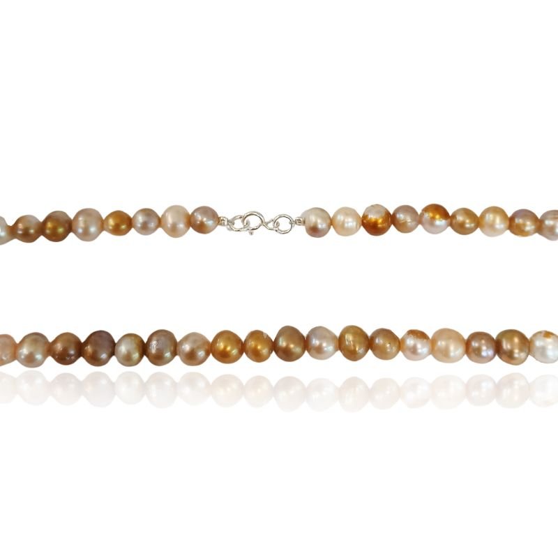 Colar delicado composto por pérolas naturais em tons champagne, com variações suaves entre o dourado e o creme. As pérolas possuem formato orgânico, garantindo autenticidade e um visual elegante e atemporal.