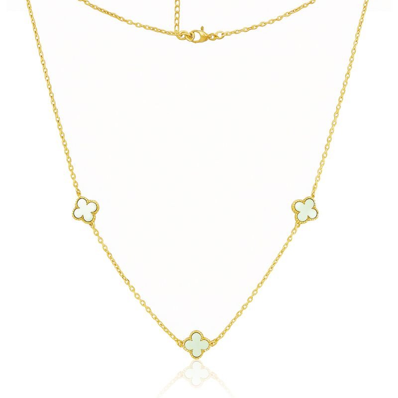 Encante-se com a delicadeza desta gargantilha folheada a ouro, com acabamento antialérgico. Seu design leve e feminino traz três pingentes em formato de trevo de quatro folhas, com detalhes em tom verde suave, simbolizando sorte, esperança e beleza. Uma peça charmosa e versátil, perfeita para iluminar o colo com sutileza e estilo, seja em looks casuais ou mais sofisticados.