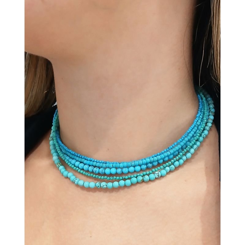 Delicada e sofisticada, esta gargantilha é feita com pedras naturais de Turquesa Azul em esferas facetadas de 2 mm, que refletem a luz com sutileza e dão um charme especial à peça. Seu tom azul vibrante transmite frescor, proteção e boas energias, sendo considerada uma pedra de equilíbrio e positividade.