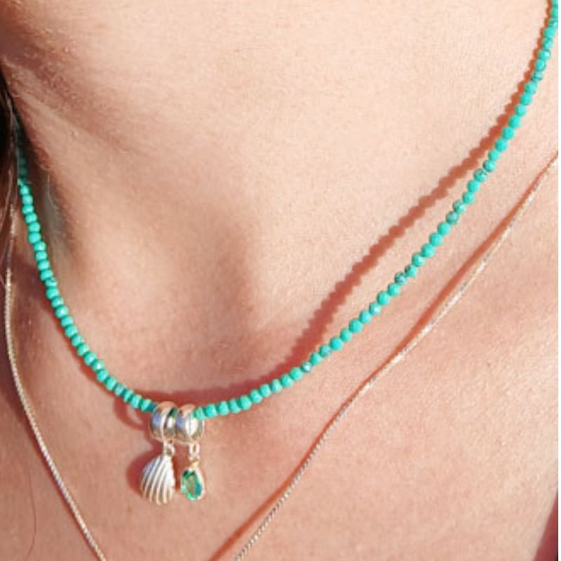 Inspirada no frescor do verão, esta gargantilha é confeccionada com pedras naturais turquesa, que trazem leveza, cor e um toque vibrante à produção. O charme da peça fica por conta dos pingentes delicados, incluindo concha e cristal de zircônia verde, que remetem ao mar e à natureza com elegância.