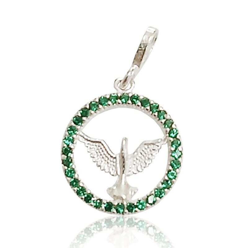Pingente Divino Espírito Santo em prata 925, com delicado contorno circular cravejado de zircônias verdes que ressaltam seu brilho e elegância. Ao centro, o divino simboliza fé, proteção e espiritualidade, tornando esta peça perfeita para expressar devoção com estilo e sofisticação.