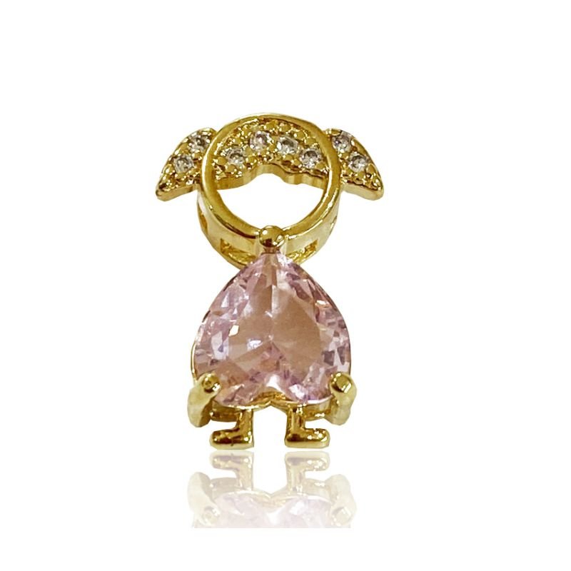 Este charmoso pingente em formato de menina é folheado a ouro 18k e traz um visual delicado e encantador. Seu corpo é formado por uma pedra em formato de coração na tonalidade rosa, símbolo de ternura e amor. Os detalhes cravejados na parte superior acrescentam ainda mais brilho e sofisticação à peça. Uma joia ideal para representar laços familiares e momentos especiais, perfeita para uso diário ou como presente inesquecível.