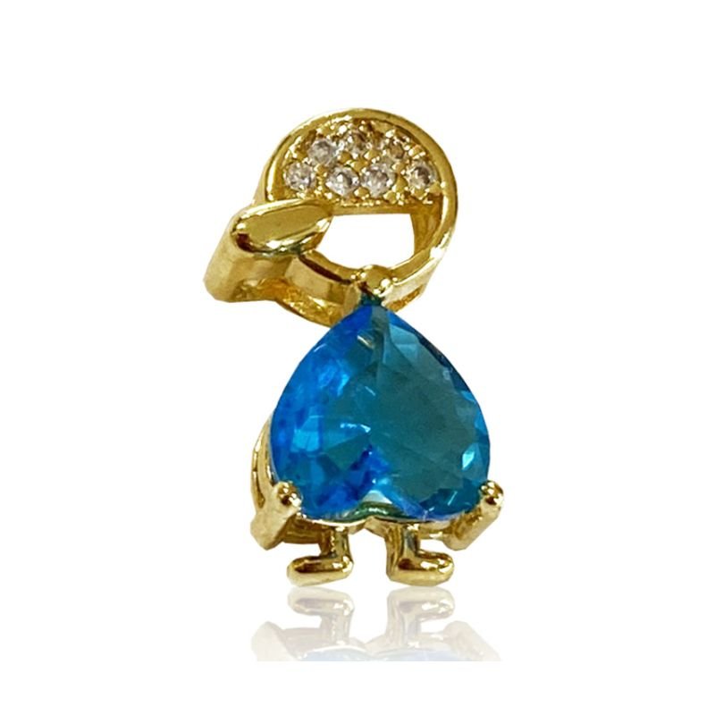 Este delicado pingente em formato de menino é folheado a ouro 18k e possui uma linda pedra em formato de coração azul como destaque central. Com acabamento detalhado e pequenos pontos de luz cravejados na parte superior, a peça transmite afeto e sofisticação. Ideal para simbolizar laços familiares ou presentear com carinho, é uma joia charmosa e significativa para eternizar momentos especiais.