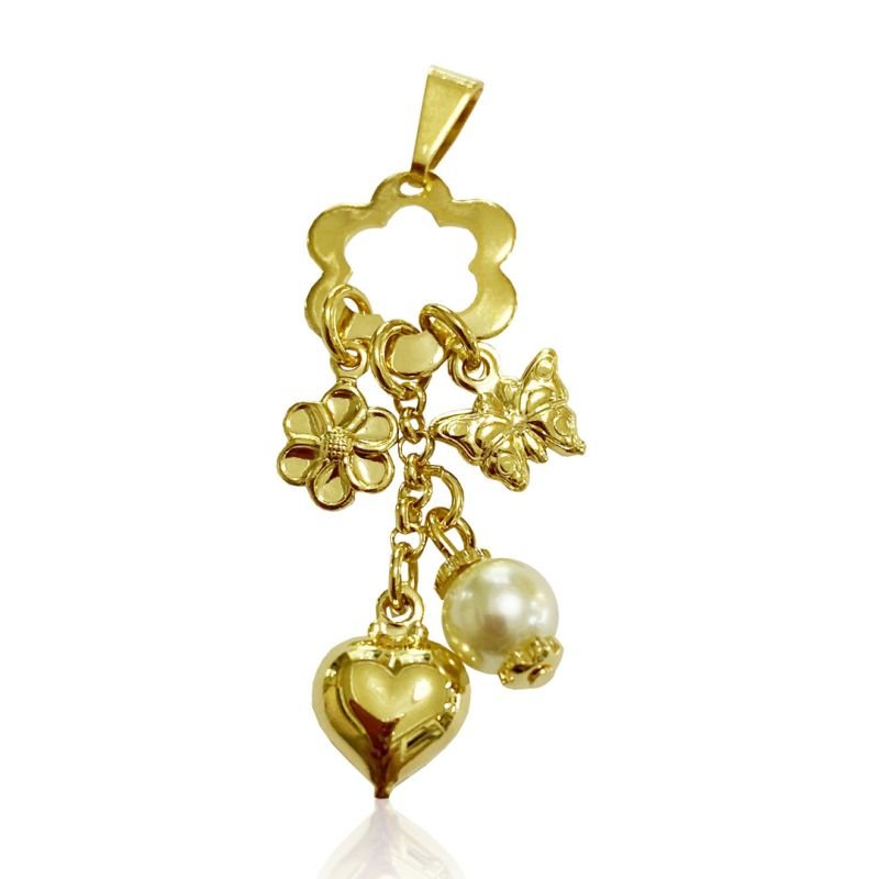 Pingente patuá folheado a ouro 18k, antialérgico, com aro em formato de flor e delicados pingentes pendurados que simbolizam amor, leveza e beleza.