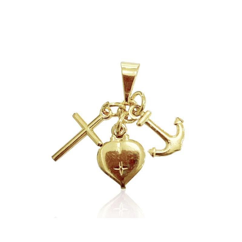 Pingente patuá folheado a ouro, antialérgico, que representa os três pilares da espiritualidade cristã: fé, esperança e caridade.