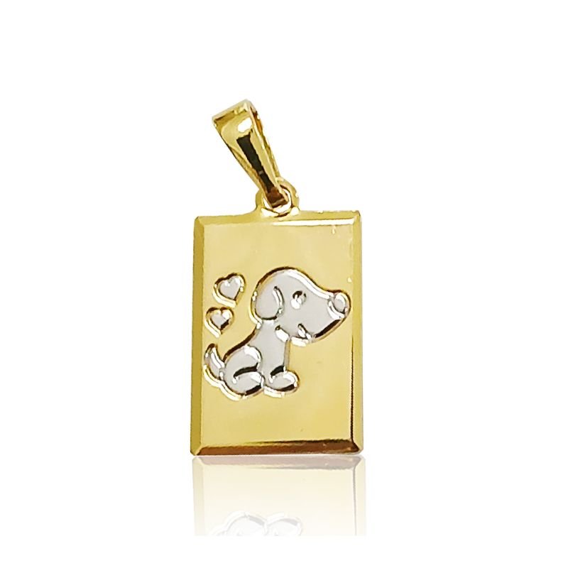 Pingente placa folheado a ouro 18k com detalhe em alto-relevo de um adorável cachorrinho e coraçõezinhos, em acabamento bicolor. Uma peça charmosa e divertida, ideal para os amantes de pets que desejam carregar consigo uma lembrança cheia de afeto. Perfeito para compor looks descontraídos com um toque de ternura e personalidade.