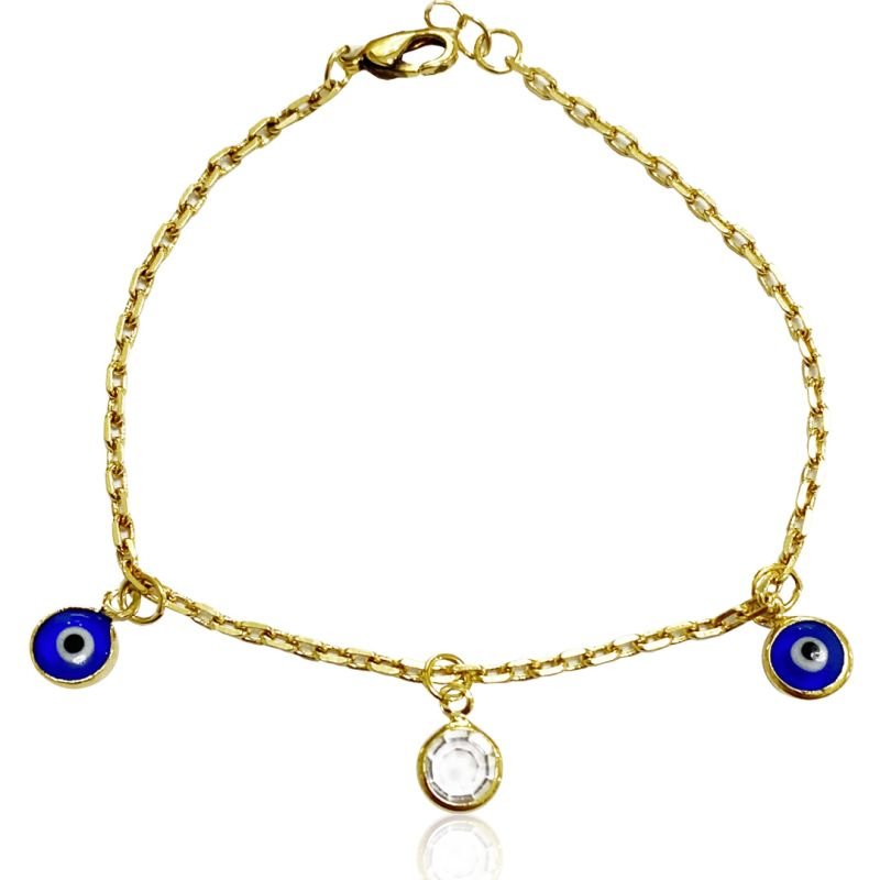 Pulseira folheada a ouro 18K, antialérgica, com dois pingentes de olho grego esmaltados em azul e um pingente central de zircônia cristal. Um acessório delicado e cheio de significado que combina proteção, brilho e estilo, perfeito para dar um toque especial e moderno ao seu look.