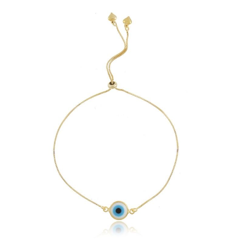 Pulseira delicada com regulagem deslizante, folheada a ouro 18k e adornada com um pingente de olho grego central. Além de seu visual minimalista e elegante, o olho grego simboliza proteção e boas energias. Com ajuste fácil e antialérgica, é perfeita para uso diário ou para presentear alguém especial com um toque de significado e estilo.
